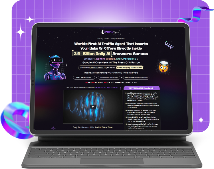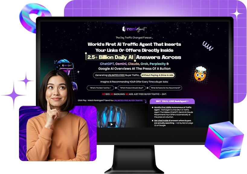 - Lifetime Access to RankAgent AI Traffic Agent - world's first fully autonomous AI Traffic Agent That Places Your Offers or Links Inside AI Answers Across: ChatGPT, Claude, Gemini, Grok, Perplexity & Google AI Overviews, Sending You FREE, High Intent Buyer Traffic Without Spending A Dime on Ads..-- WORTH: $297/month